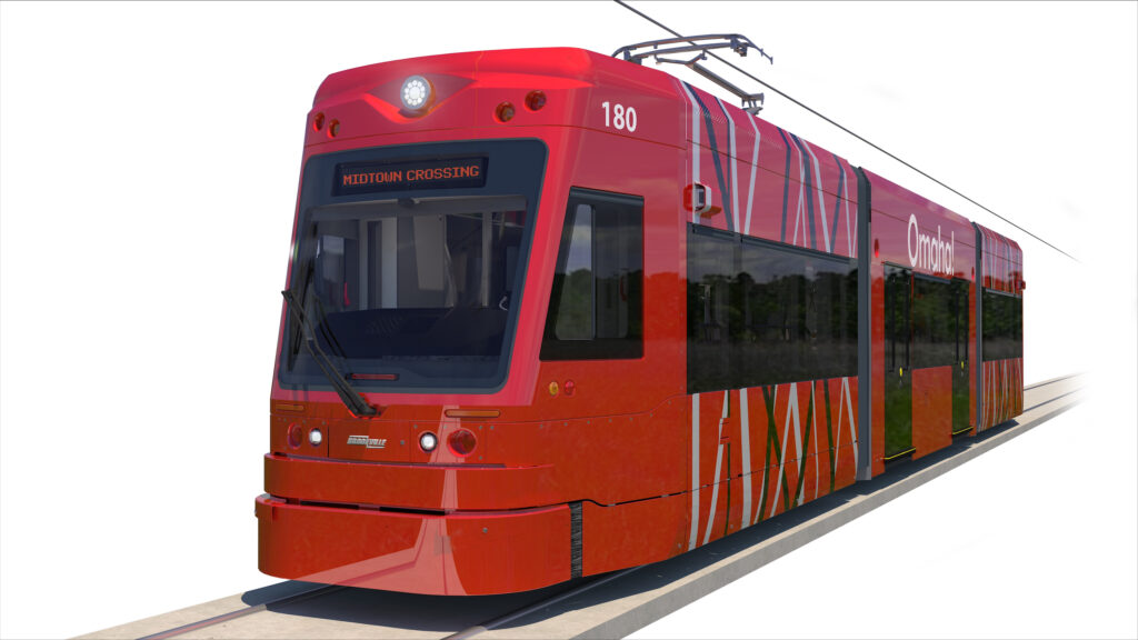 An example of what a modern streetcar looks like. Omaha’s design, color and other details will depend on the manufacturer and vehicle specifications yet to be decided. (Courtesy of Brookville Equipment Corp.)