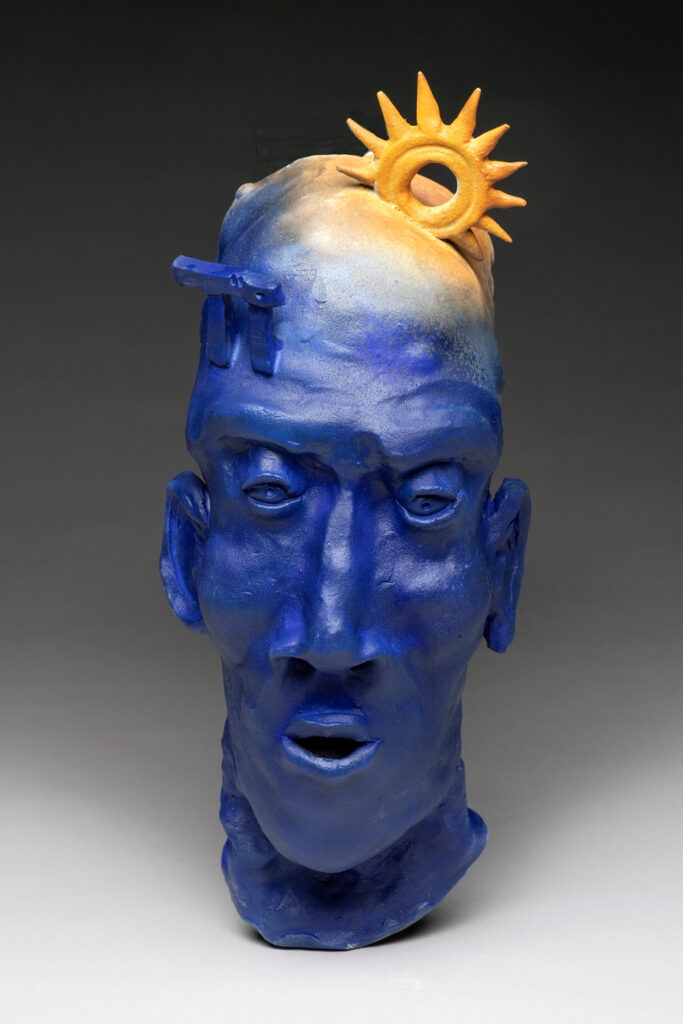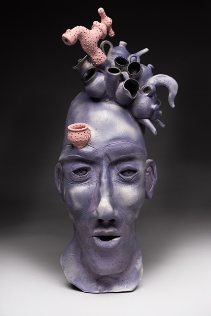 “Often, I do integrate teapots and teacups on these face sculptures,” said Dennison. “No surprise, since I’m a potter. But people often do ask. For me, the sharing of tea suggests a communion with others, a mulling over of ideas, and, of course, tea and teapots have had a long and historical significance to potters. A quiet nod to those who have lived that tradition.”