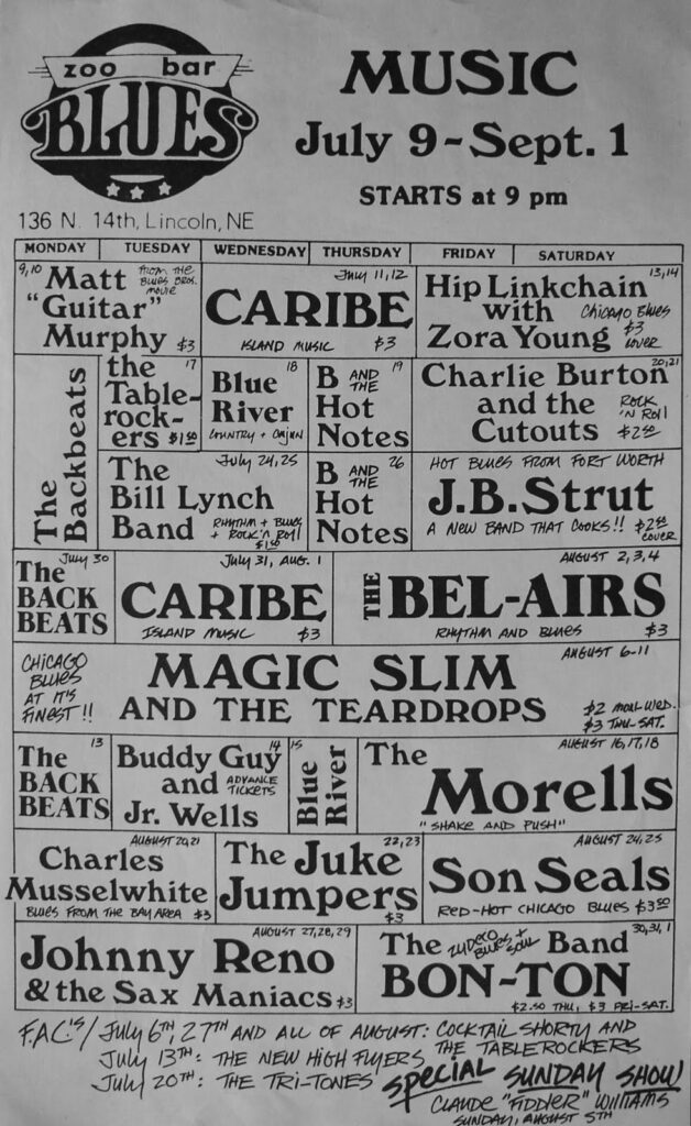 Zoo Bar calendar, likely 1984. Note the mind-bogglingly low cover charges, week-long Magic Slim stint and multiple dates by many popular artists including Johnny Reno. From the archives of Dave Robel.