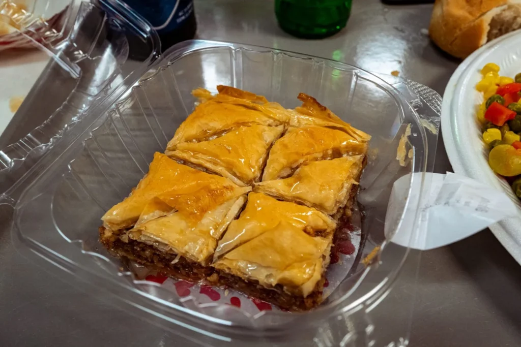 Karithopita, a Greek walnut spice cake with syrup, had a texture close to banana bread, with a moist, dense finish and a flavor touched with baking spices like cinnamon and clove. The baklava, flaky and tender with a warm, crunchy, nutty filling, is also top notch.