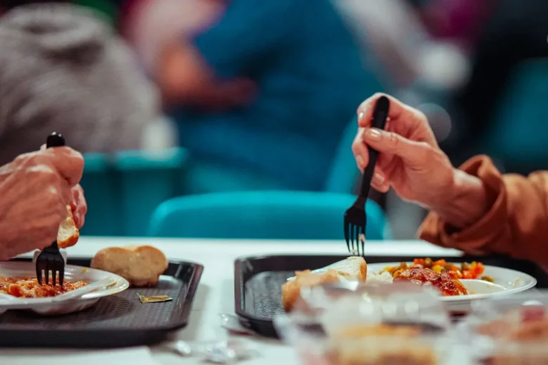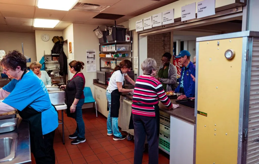 Each week, volunteers from the men’s club, led by their president, Bill Kellen, gather in the kitchen. They par-cook two types of pasta and five different meatless sauces: alfredo, beer cheese, spicy red sauce, marinara and garlic. One popular option is mixing the sauces.