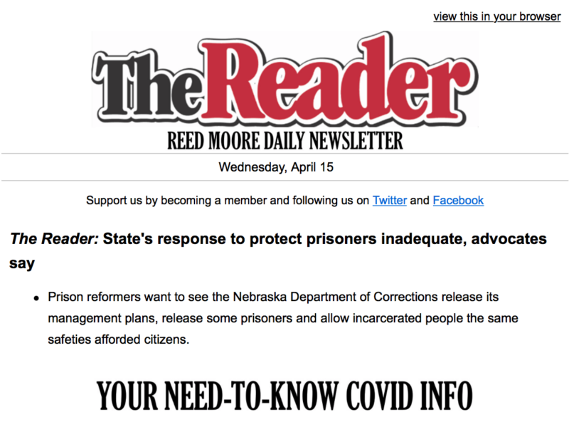 Posted inHealth, News, Theater, Uncategorized Advocates Call for More Action, Transparency to Protect Nebraska Inmates from Coronavirus by Chris Bowling April 15, 2020