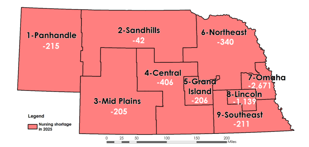 Depicts the projected nursing shortages by region of Nebraska in 2025.