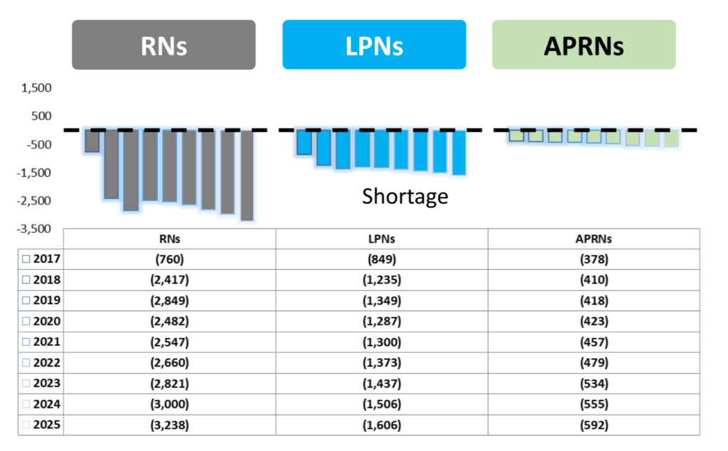 The CFN projects a nursing shortage of 5,345 full-time nurses by 2025, according to its 2017 workforce model. This number combines predicted resident nurse, licensed practical nurse and advanced practice registered nurse gaps.