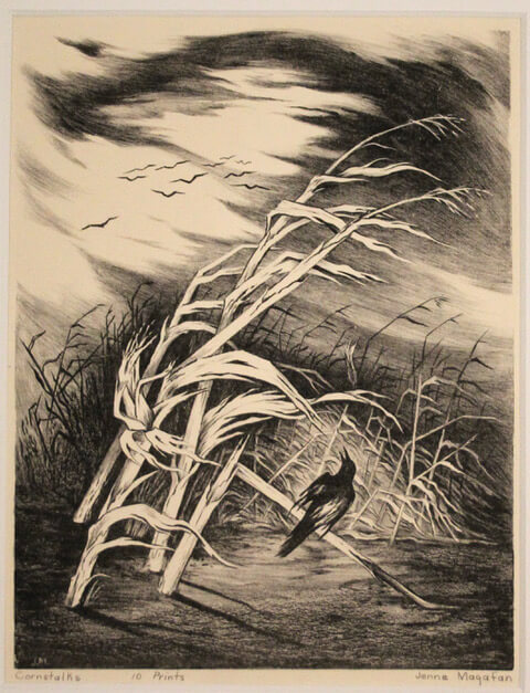 The twin sisters Ethel and Jenne Magafan, who created drypoint and lithographic prints, respectively, are featured here with detailed and romanticized everyday situations of wash on a clothesline and corn in the wind, rendered with an experienced artists touch.