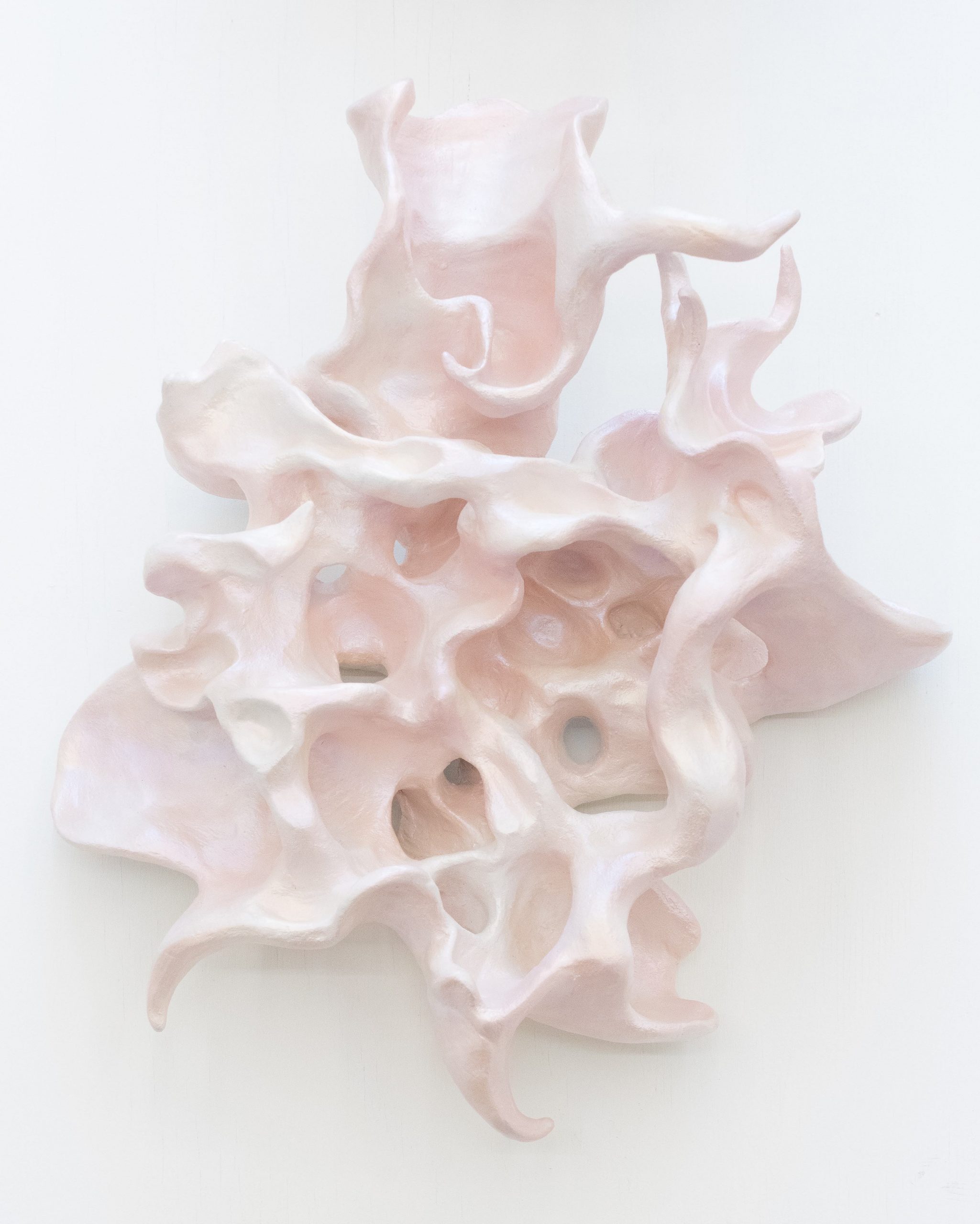 He cites two ceramic sculptures, which “gleam with an opalescent sheen. Another labyrinthine sculpture has been Raku-fired, its oil-spilt patina and amorphous form are earthen and alien in a single breath. They curl and twist, obscuring and revealing pockets of light and shadow.”