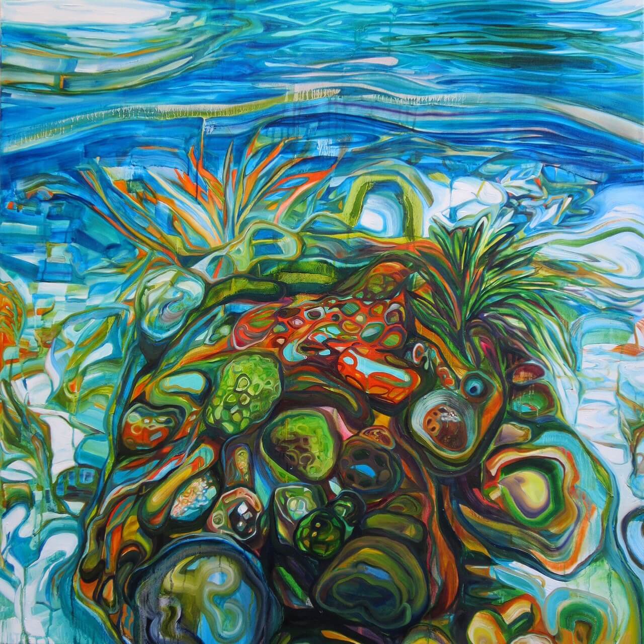 Where Allan Tubach’s environment is usually the city and his palette begins with that of glass, steel, brick and concrete, Lisa Tubach’s world is the organic riot of nature and the intricate beauty of its more hidden structures. The younger Tubach, who now lives in Virginia’s Blue Ridge country, is attuned to the sublimity and fragility of the ecosystems, and her bright, abstracted paintings embrace their currents and flux.